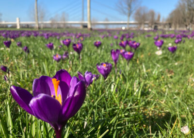 Seit der Initialpflanzung im südlichen Rheinpark kamen neue Flächen im nördlichen Rheinpark, dem Hofgarten und an der Kaiserpfalz dazu. Inzwischen haben wir rund 11 Millionen Krokuszwiebeln in Düsseldorfer Grünflächen gesetzt. Damit zählt das Blaue Band zu den größten innerstädtischen Krokuspflanzungen Europas.