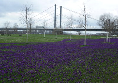 Die Pflanzflächen waren teils lückenhaft, besonders im südlichen Bereich des Rheinparks. Dort wurden Nachpflanzungen von 1,24 Mio. Krokussen (7.000 m²) vorgenommen. Die Pflanzung erfolgte maschinell im Oktober 2025. Danke an unsere Mitglieder, die den Fortbestand unserer Projekte gewährleisten!