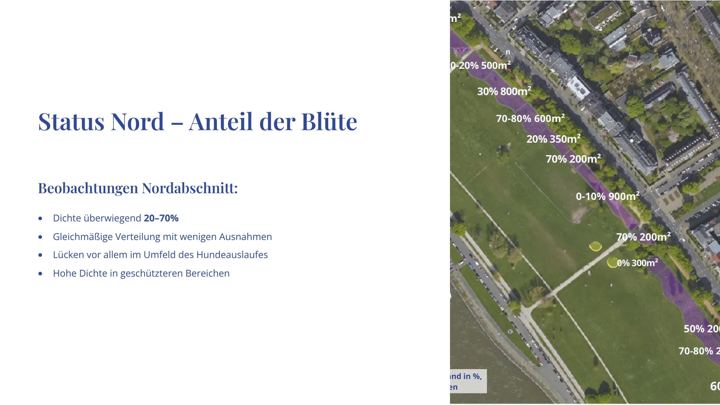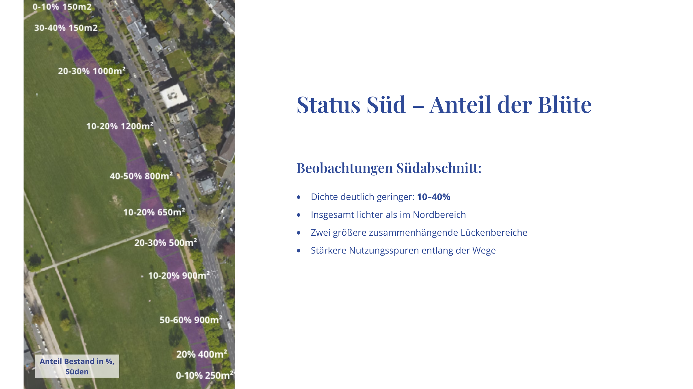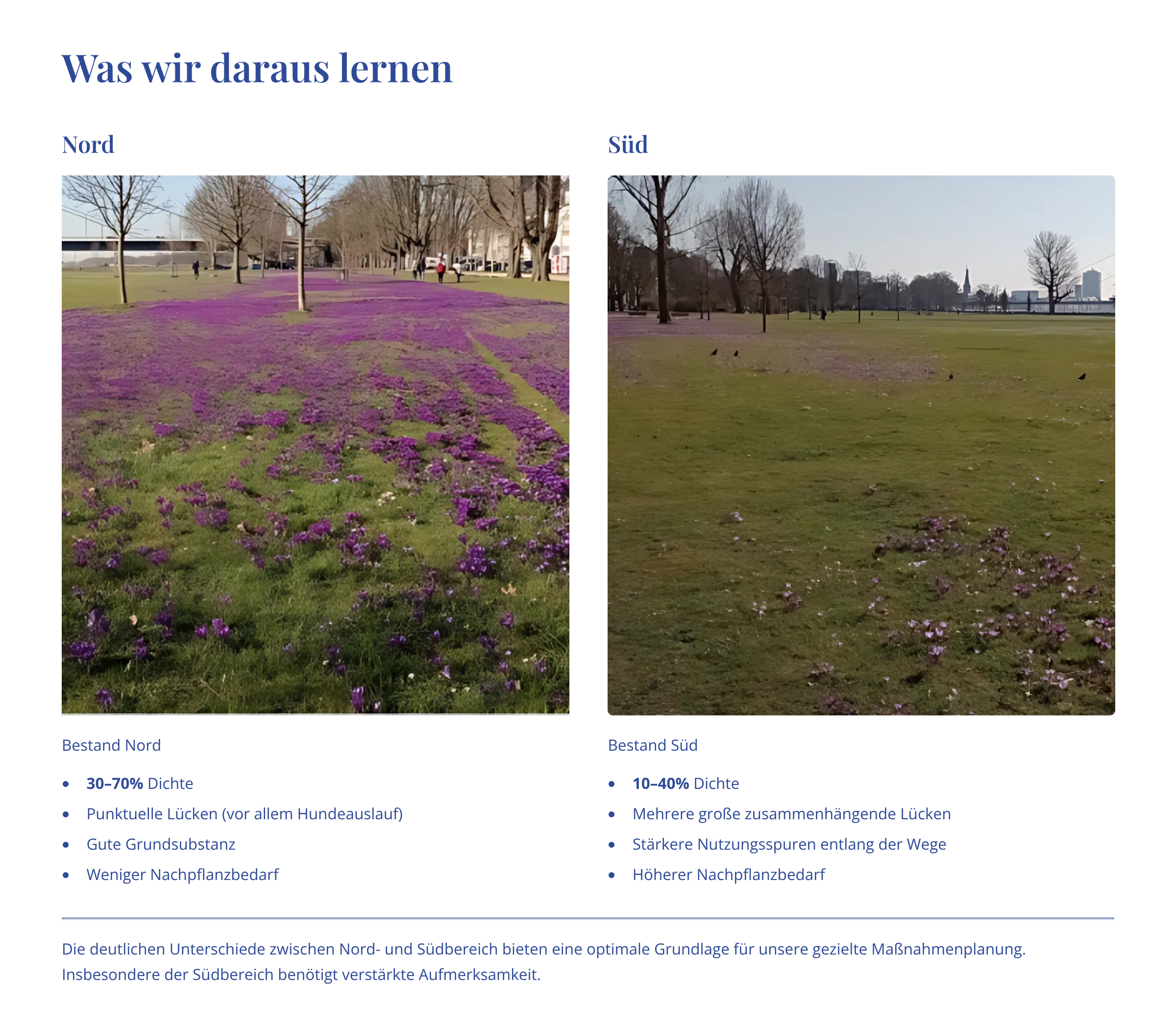 Die Pflanzflächen sind teils lückenhaft, besonders im südlichen Bereich des Rheinparks. Dort planen wir eine Nachpflanzung von 1,24 Mio. Krokussen (7.000 m²). Die Pflanzung erfolgt maschinell im Oktober 2025. Ihre Mitgliedschaft trägt direkt zur Umsetzung bei.