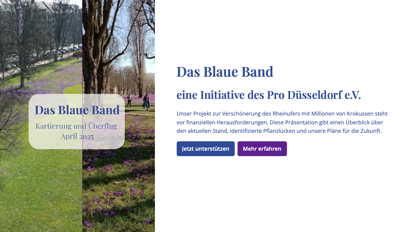 Unser Projekt „Das Blaue Band am Rhein“ zur Verschönerung des Rheinufers mit Millionen von Krokussen steht vor finanziellen Herausforderungen. Diese Präsentation gibt einen Überblick über den aktuellen Stand, identifizierte Lücken und unsere Pläne für die Zukunft.