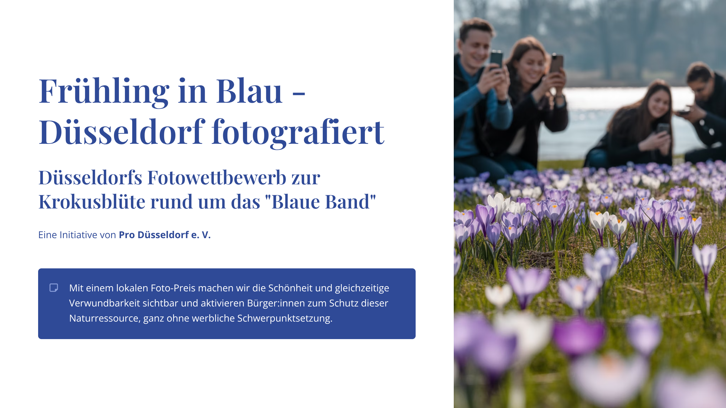 Wenn Düsseldorf blau aufblüht, seid ihr die Augen der Stadt: Der Fotowettbewerb zeigt die schönsten Krokus-Momente, von feinen Makros bis zu urbanen Weitblicken. Start: Frühjahr 2026.