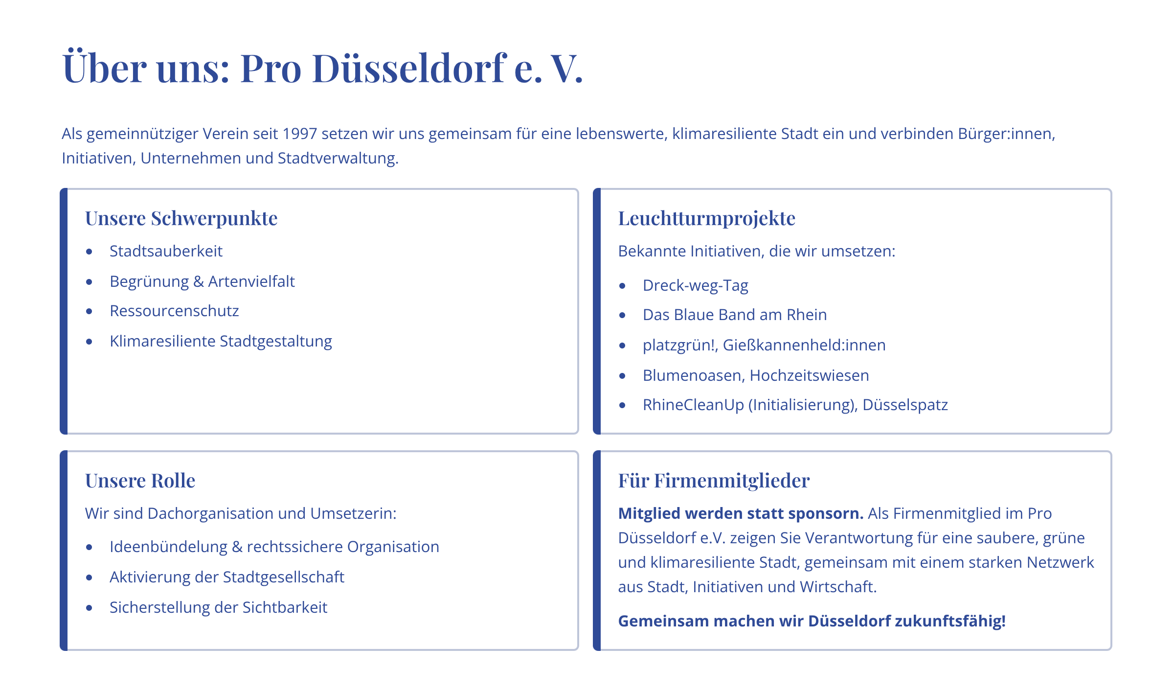 Werden Sie Teil unseres Netzwerks und unterstützen Sie konkrete Projekte in Düsseldorf – mit unseren Initiativen für eine grünere und lebenswertere Stadt!