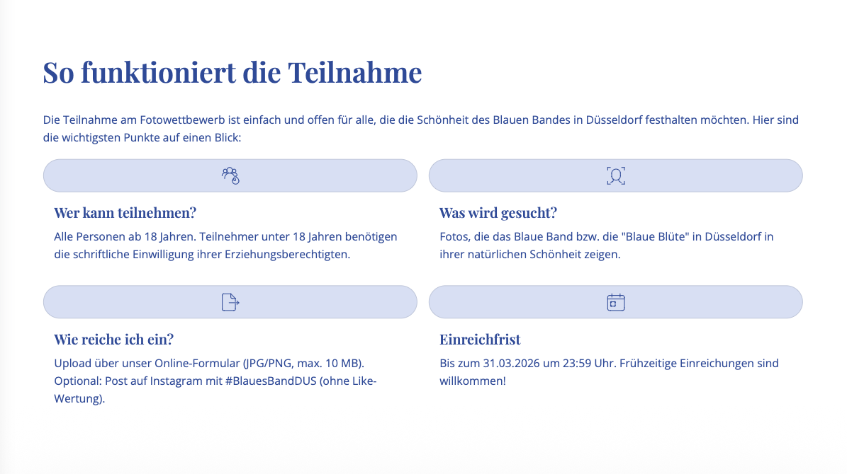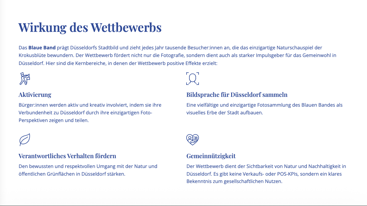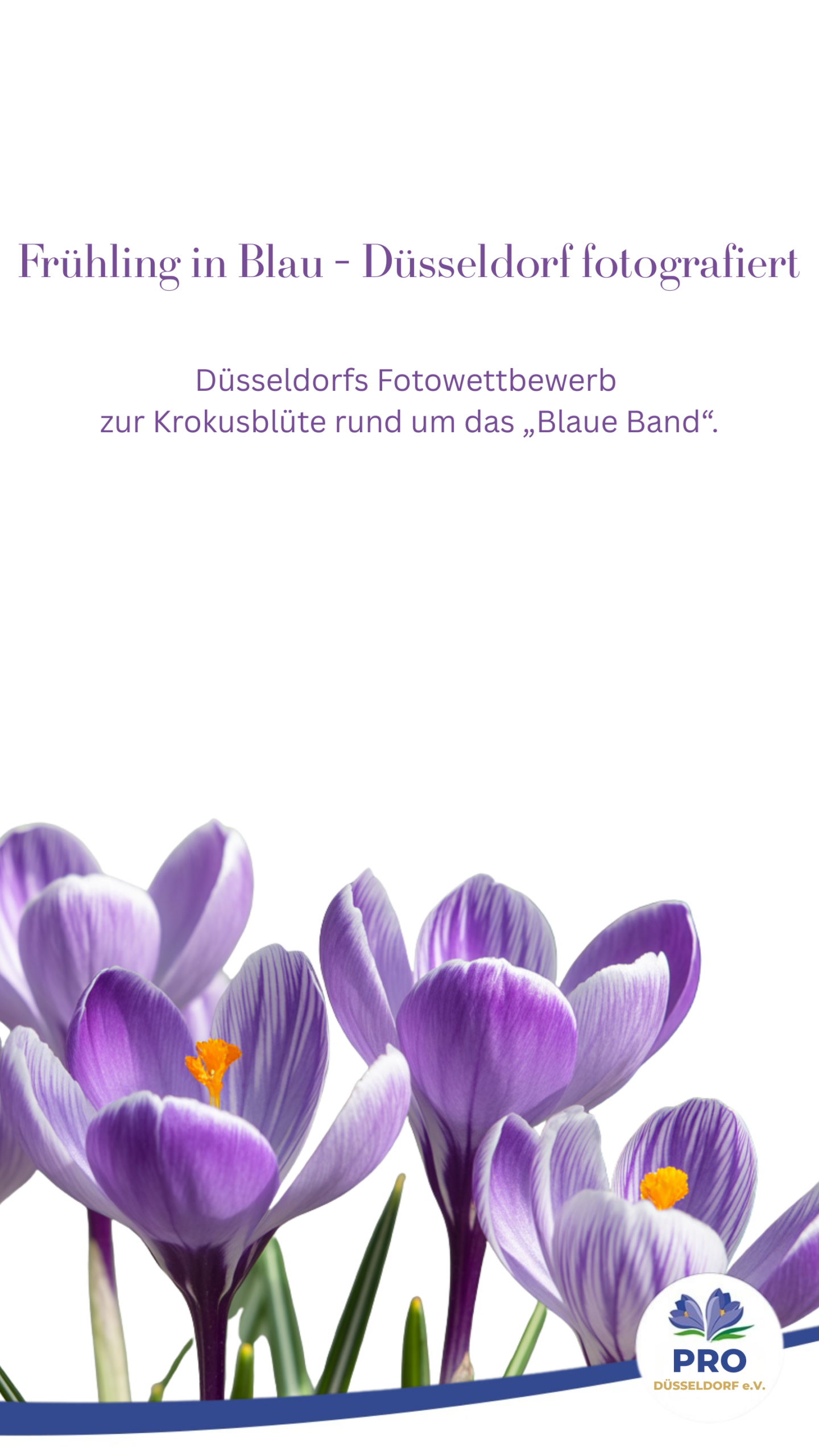 Düsseldorfs gemeinnütziger Fotowettbewerb zur Krokusblüte rund um das „Blaue Band“.Mit „Frühling in Blau“ machen wir die besondere Krokusblüte in Düsseldorf sichtbar und gleichzeitig ihre Verletzlichkeit. Der Fotowettbewerb lädt Bürger:innen ein, das Blaue Band in Bildern festzuhalten und schafft Bewusstsein für den respektvollen Umgang mit dieser Naturressource. Das Projekt ist eine gemeinnützige Initiative von Pro Düsseldorf e. V., ohne werbliche Schwerpunktsetzung.