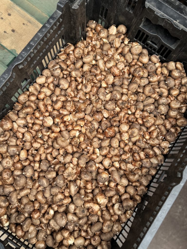 Die Krokusse werden in 50‑cm‑Streifen maschinell gesetzt: Die Grassode wird kurz angehoben, die Zwiebeln fallen in die Furche, anschließend schließt sich die Narbe wieder. Oktober ist der ideale Pflanzzeitpunkt, da Geophyten einen Kältereiz benötigen, um im Februar/März auszutreiben.